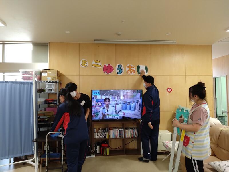 入所者が40数人と比較的に小規模で年齢を重ねた方が多い寮でした。生徒はお祭りの雰囲気づくりということで、ホールにお祭りの装飾をしたり、縁日風にジュースを引き換えたり、キッチンカーのカレーライスの受け渡しのお手伝いをしました。